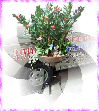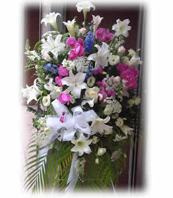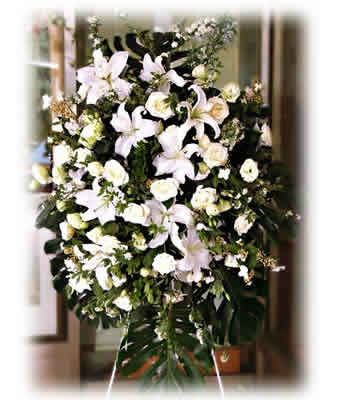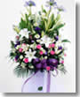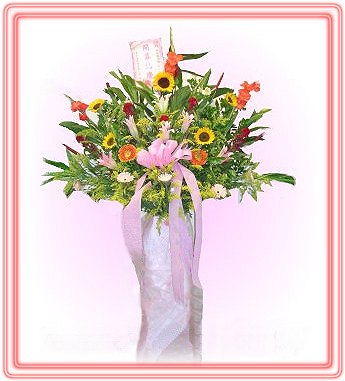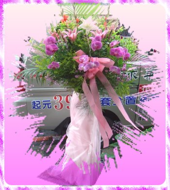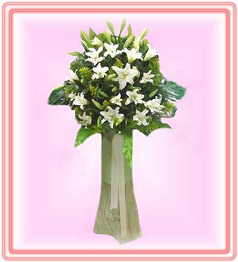 花材:香水百合,綠色配材,緞帶,鐵架,高級包裝紙,彩帶