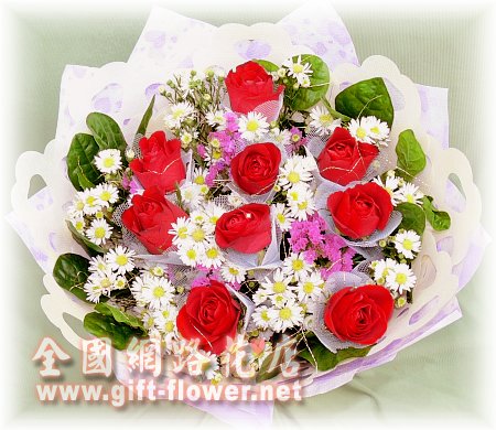 花材:紅玫瑰11朵+粉色星辰+白孔雀+茉莉葉