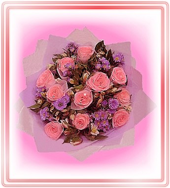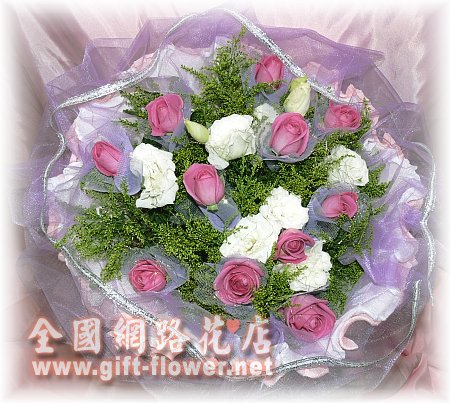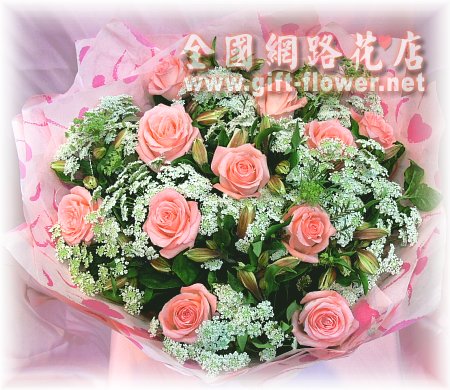 花材:11朵粉紅玫瑰, 高級包裝紙,細蕾絲紗