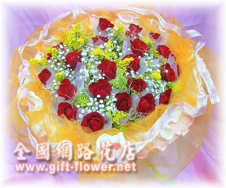 花材:紅玫瑰21朵+麒麟草+滿天星
