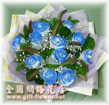 花材:藍玫瑰11朵+茉莉葉+滿天星