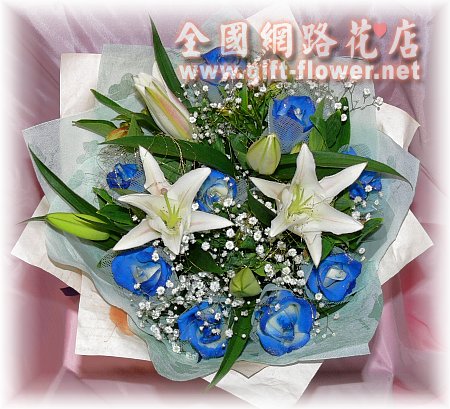 花材:馬可百合6朵+藍玫瑰9朵+滿天星