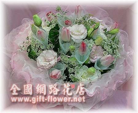 花材:粉色鬱金香10躲+蕾絲花+洋桔梗