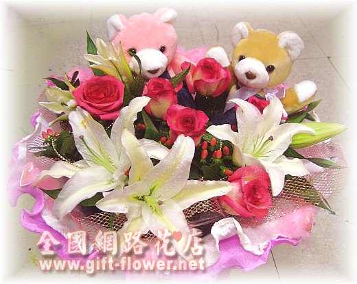 花材:香水百合6朵+粉玫瑰6朵+寶貝熊1對