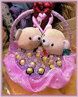 花材:2隻大頭熊21粒金莎,1個小愛心