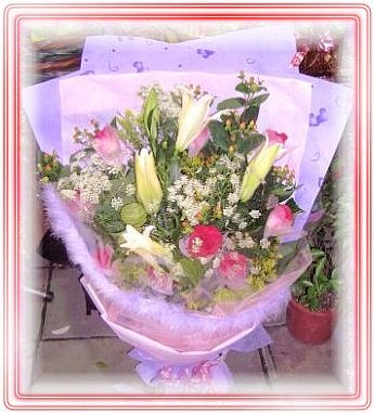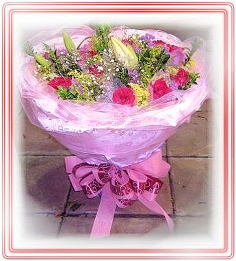 花材:香水百合5朵, ,紅玫瑰5朵, ,粉紅玫瑰5朵