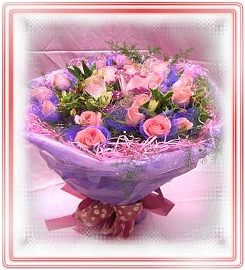 花材:粉百合9朵+香檳玫瑰11朵+滿天星+紫色星辰+綠色葉材